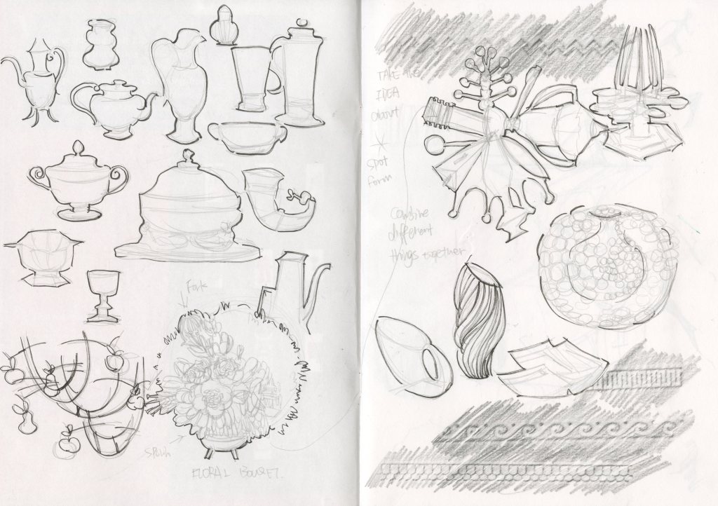 #The first geometric product was one of the items that impressed me on the first day. What I find magical is that it is a completely artificial creation, so it is means in nature, this kind of shape can not be naturally produced, and the author says this is an experiment creation, so I think it is a very good inspiration source for my fashion design. Those form is unusual shape could be the garment silhouette. If you look closely, you can also find that the way of lighting makes his shadows repeat differently. #The following ruler is more of a flat geometric creation, compared to the craft ornament above. This is a more functional tool. Mentioned in the introduction “practical benefit to designers” Feeling this one can help create a lot of pattern or print inspiration.Meiping Vase was attracted me a lot. Very clean white porcelain except the eyes and tongue are all white glaze. And the author combines the two just because that year is the Year of the Snake. I am interested in the combination of living things and lifeless things, similar to combining animals with objects and finding other samples. Because of the different ages and with differences aesthetic , these artefact are very different, some are just for decorative, some have special functions and some even have religious meanings (can’t really tell if just see it without Introduction)In the silver exhibition area There are a lot of cutlery teapots I drew a lot of their silhouettes and then noticed this work the FLORAL BOUQETFLORAL BOUQET is made by RCA Alumni. This is a recycled pieces and make the tableware turned into flowers. Then I also found a lot of different materials to make the shape of the flower (ceramics and iron)In my opinion, is people like this kind of contrasting feeling, using hard materials to create soft things. Also we could feel the high skill of artefacts. And after talking with Clare I got the words “Permanent” to realized that the limited life of flowers has become a kind of immortal form through these creations.